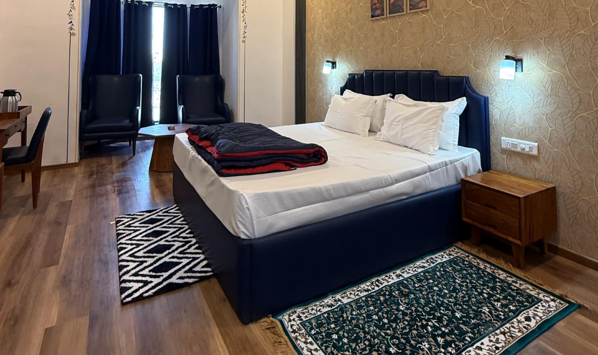 The Super Deluxe Room features a separate bedroom and living area, a private bathroom with both a shower, and a balcony offering stunning views of the pool or garden.
